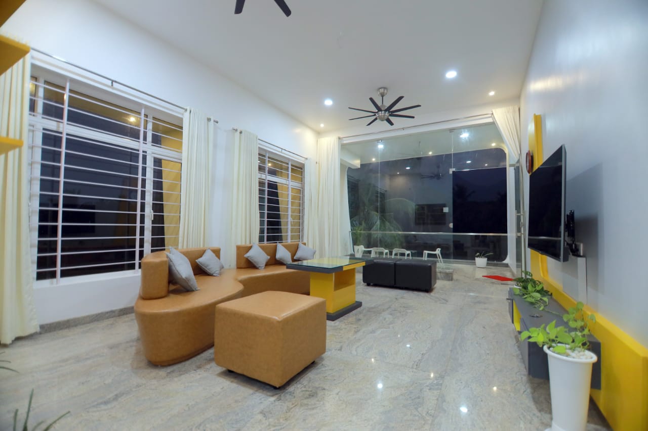 Experience the perfect blend of simplicity and elegance in our spacious living room. Designed to bring nature closer, it features a fully transparent glass wall that offers uninterrupted views of the lush greenery and surrounding landscape — an ideal spot to relax and unwind.