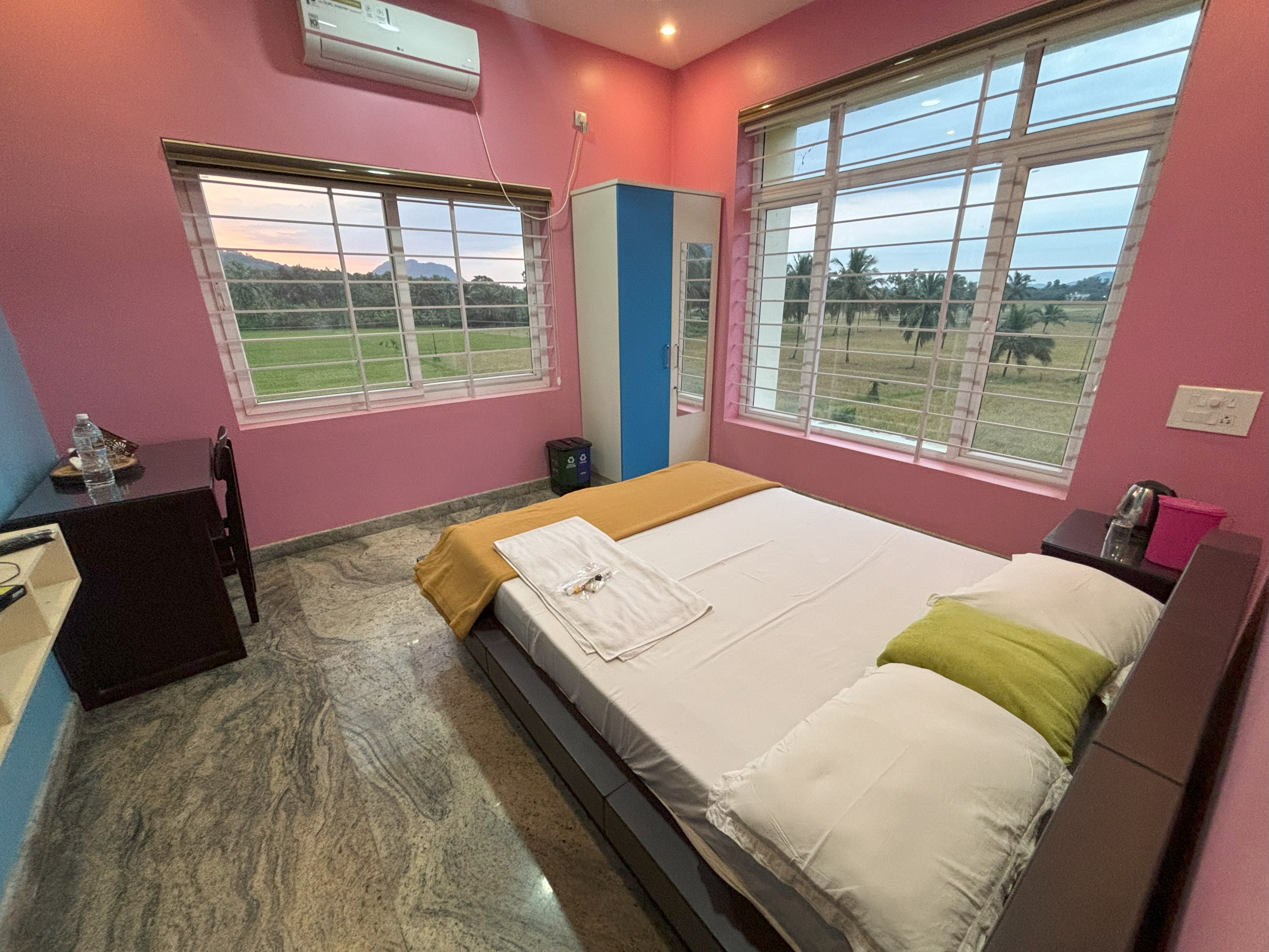 Our Deluxe Bedroom comfortably accommodates up to two adults and one child. The room is thoughtfully furnished with a queen-size bed, a reading table with chair, a flat-screen television with cable connection, complimentary high-speed Wi-Fi, and a wardrobe. Guests also have access to a spacious shared bathroom, making it perfect for a relaxing and convenient stay.